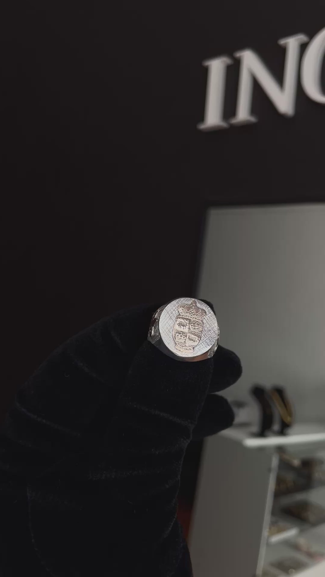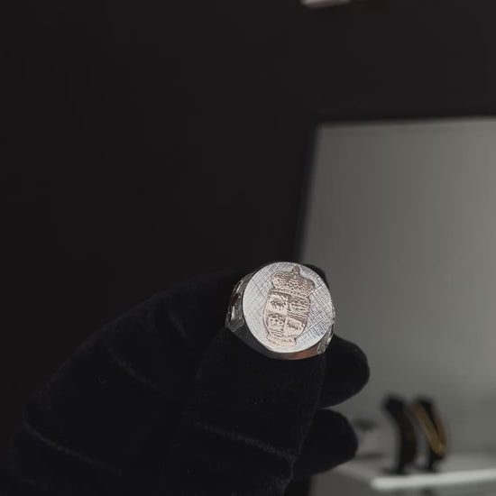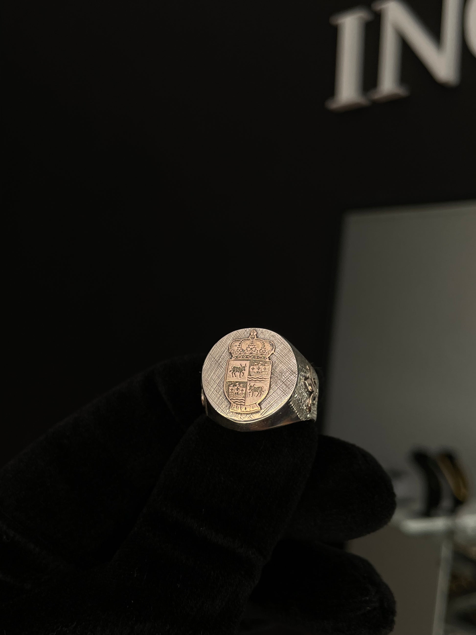 Anillo Sello en Plata con Escudo Familiar en Oro y Apliques laterales en Oro